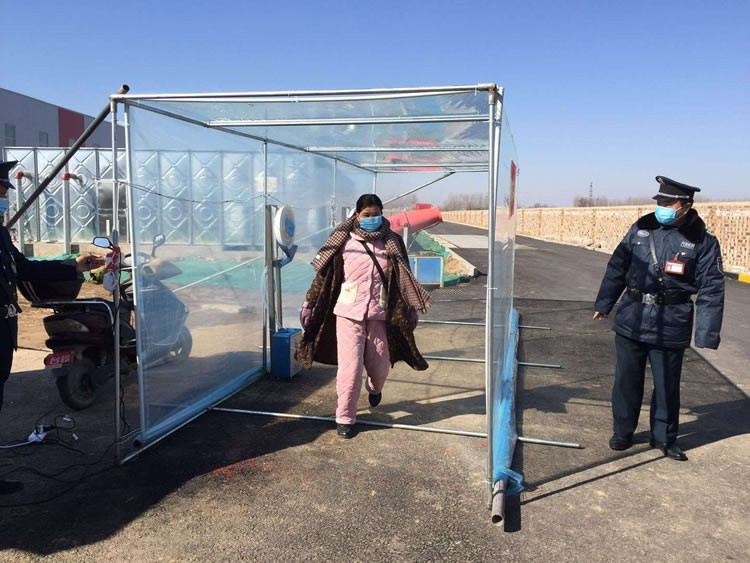 2、翱翔科技有限公司防疫嚴密,利用公司產(chǎn)品設立防疫消毒通道,保安員負責測量人員體溫、登記,監督人員在防疫通道消毒后進(jìn)入廠(chǎng)區。